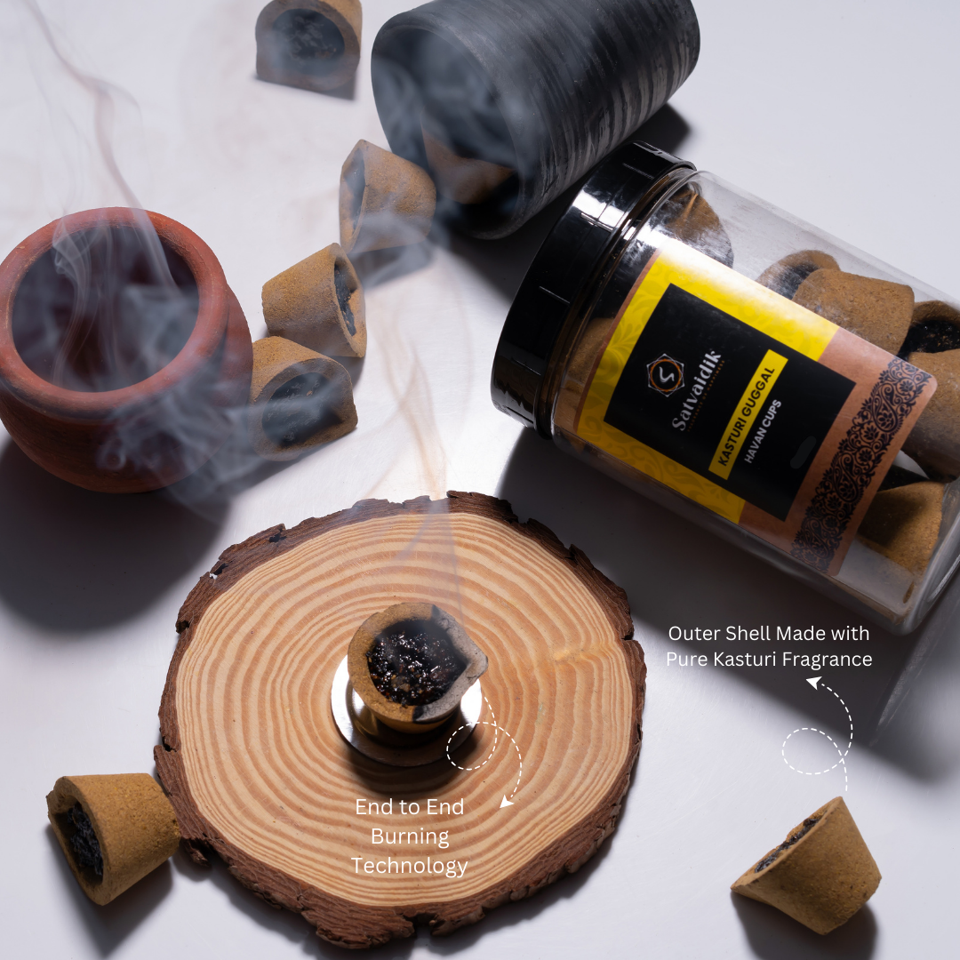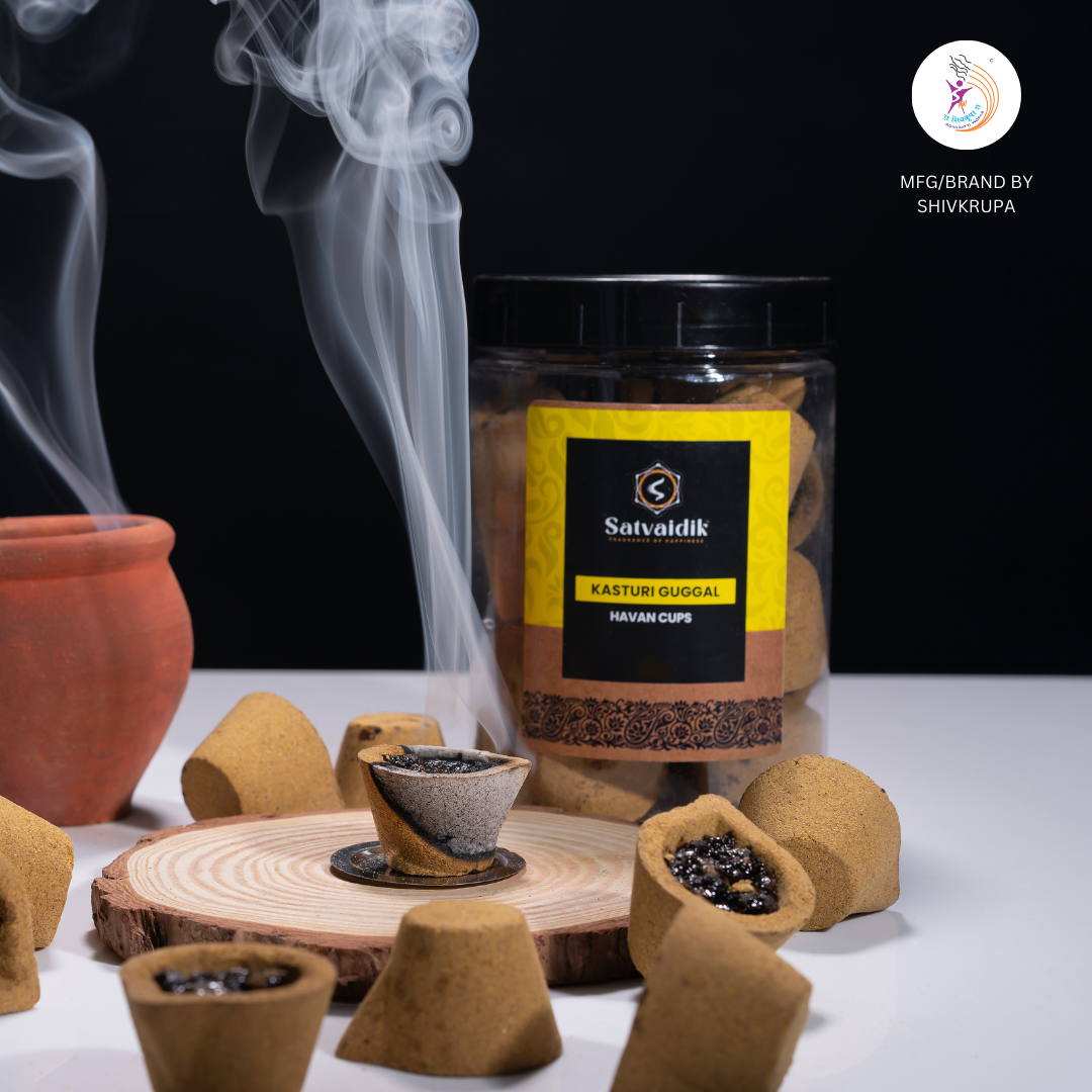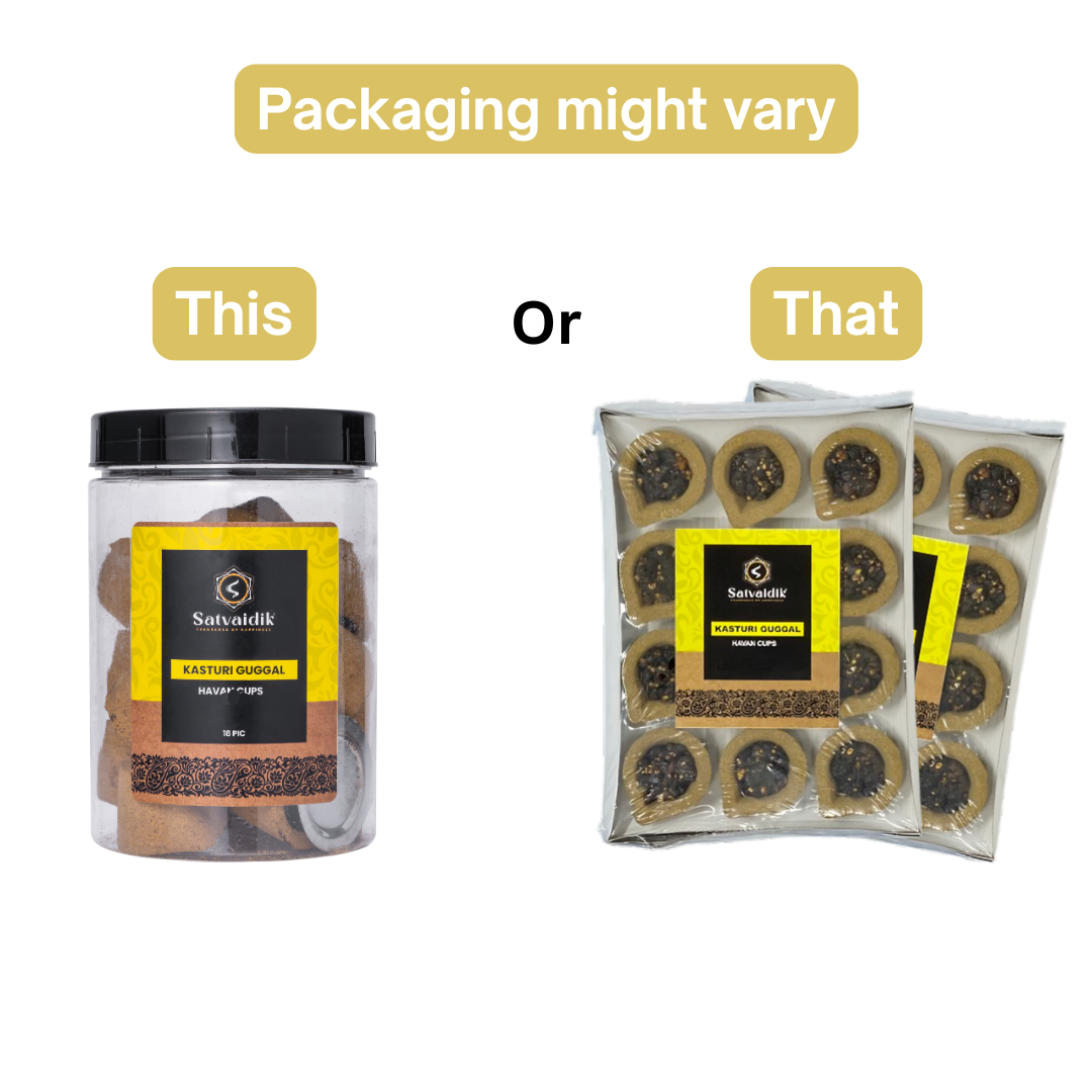 Shivkrupa Agarbatti Works brings you a premium collection of havan cups that will elevate your spiritual rituals. This set includes five varieties: Kasturi Guggal, Arabian Loban, Oud Guggal, Kesar Guggal, and Vaishnavi Gau Guggal. Each variety comes in a pack of 18 cups, making it a total of 90 cups. Crafted with utmost care, these cups release a divine aroma that creates a serene ambience for your pooja, home, or festivals. The set also includes a burner plate for your convenience. Embrace the sacred fragrance and connect with the divine through these organic havan cups. Dimensions: Each cup measures approximately 4 cm in diameter and 2.5 cm in height.