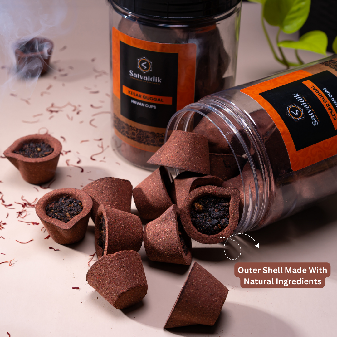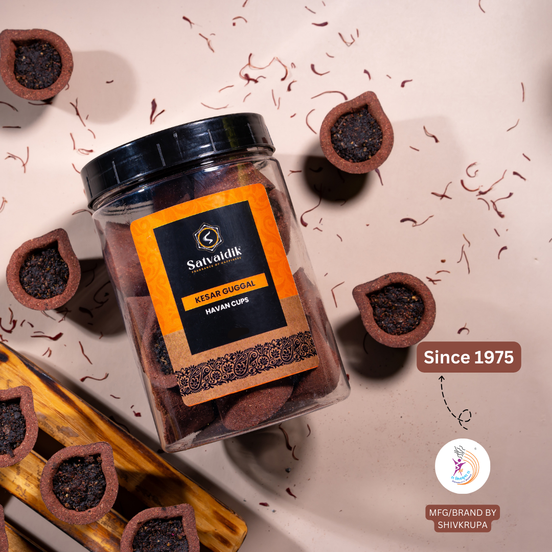 Shivkrupa Agarbatti Works brings you a premium collection of havan cups that will elevate your spiritual rituals. This set includes five varieties: Kasturi Guggal, Arabian Loban, Oud Guggal, Kesar Guggal, and Vaishnavi Gau Guggal. Each variety comes in a pack of 18 cups, making it a total of 90 cups. Crafted with utmost care, these cups release a divine aroma that creates a serene ambience for your pooja, home, or festivals. The set also includes a burner plate for your convenience. Embrace the sacred fragrance and connect with the divine through these organic havan cups. Dimensions: Each cup measures approximately 4 cm in diameter and 2.5 cm in height.